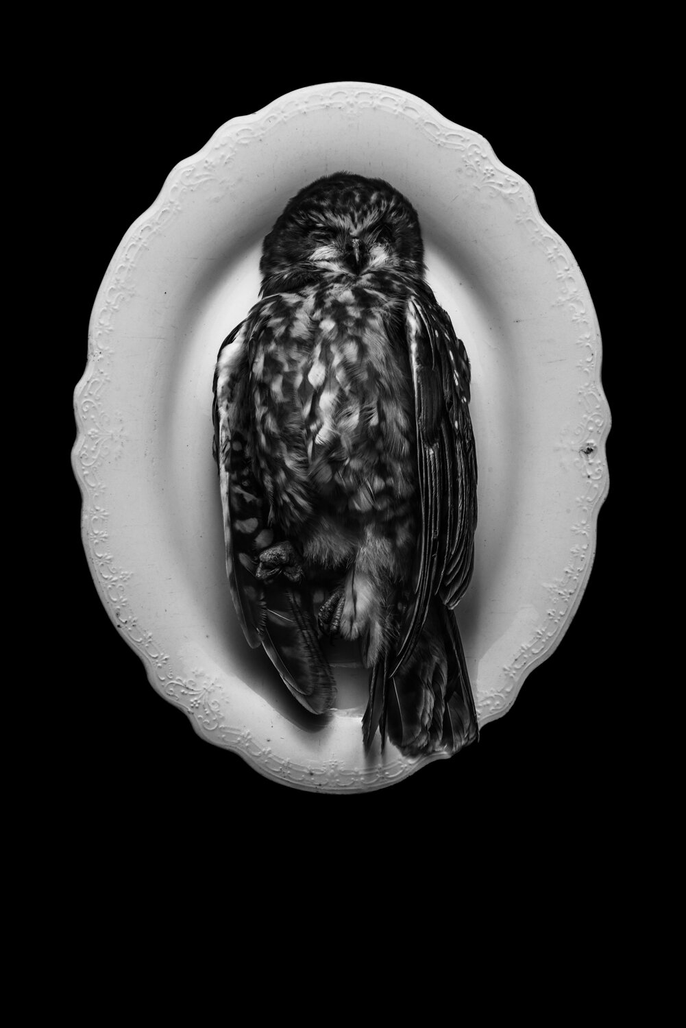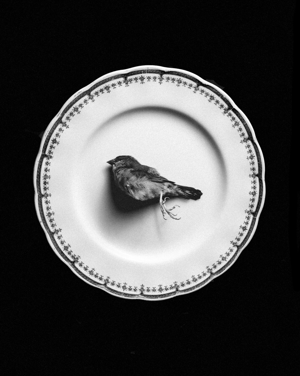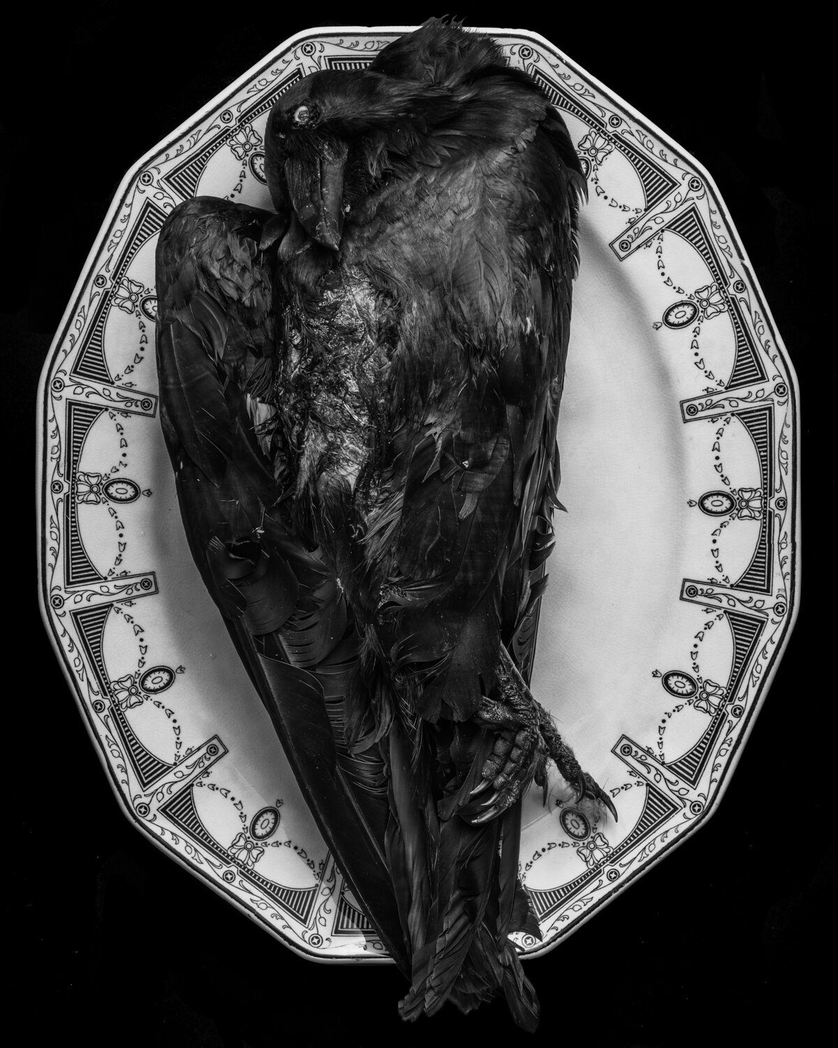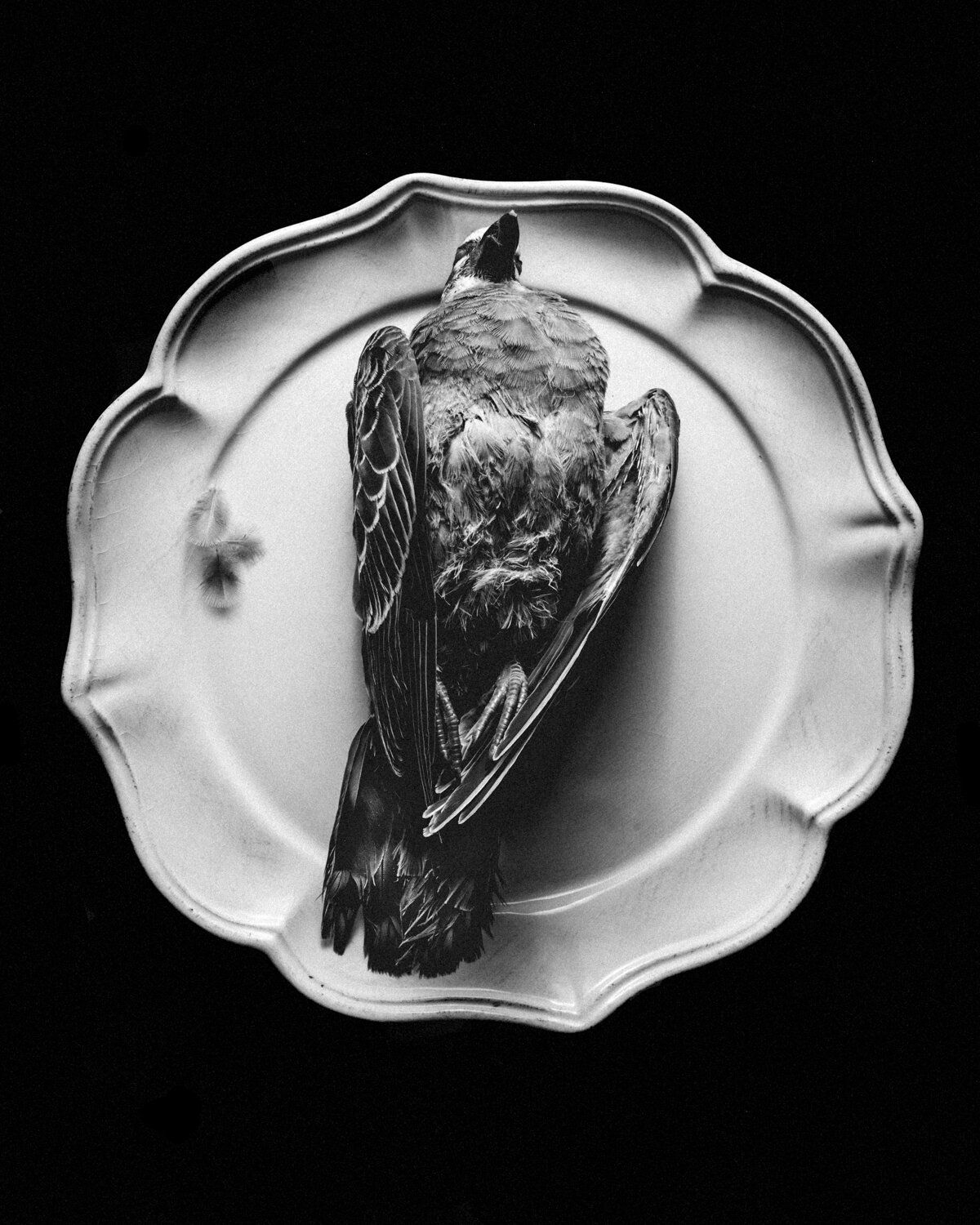 This has begun to interest me and so I have embarked on a series of images beginning with birds who have passed on dressed in their fine feathers and preserved for a moment or suspended in time on a beautiful, yet static platter. My intention was to photograph the dissolving of these feathered bodies over time as a record of their beauty and of their impermanence.