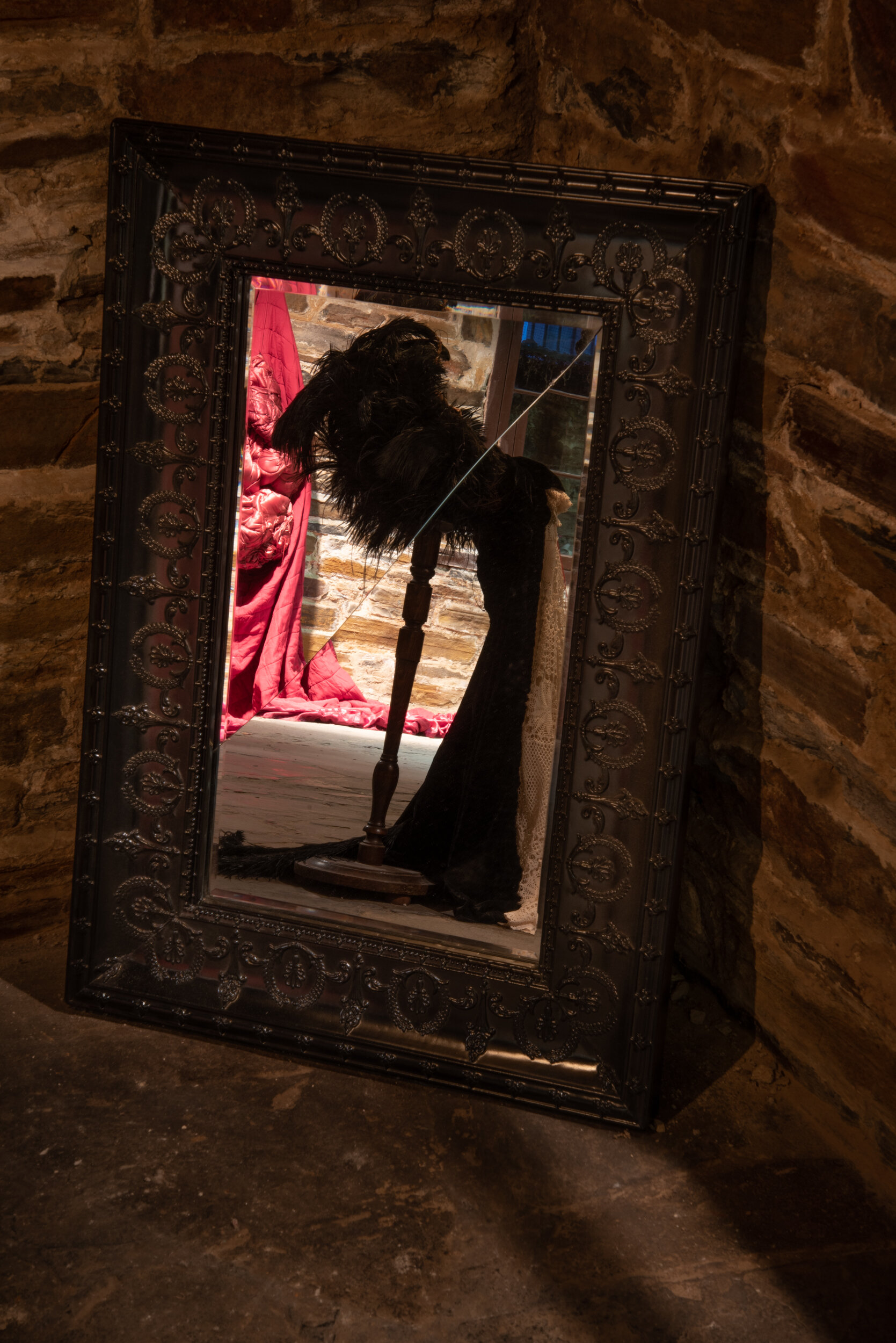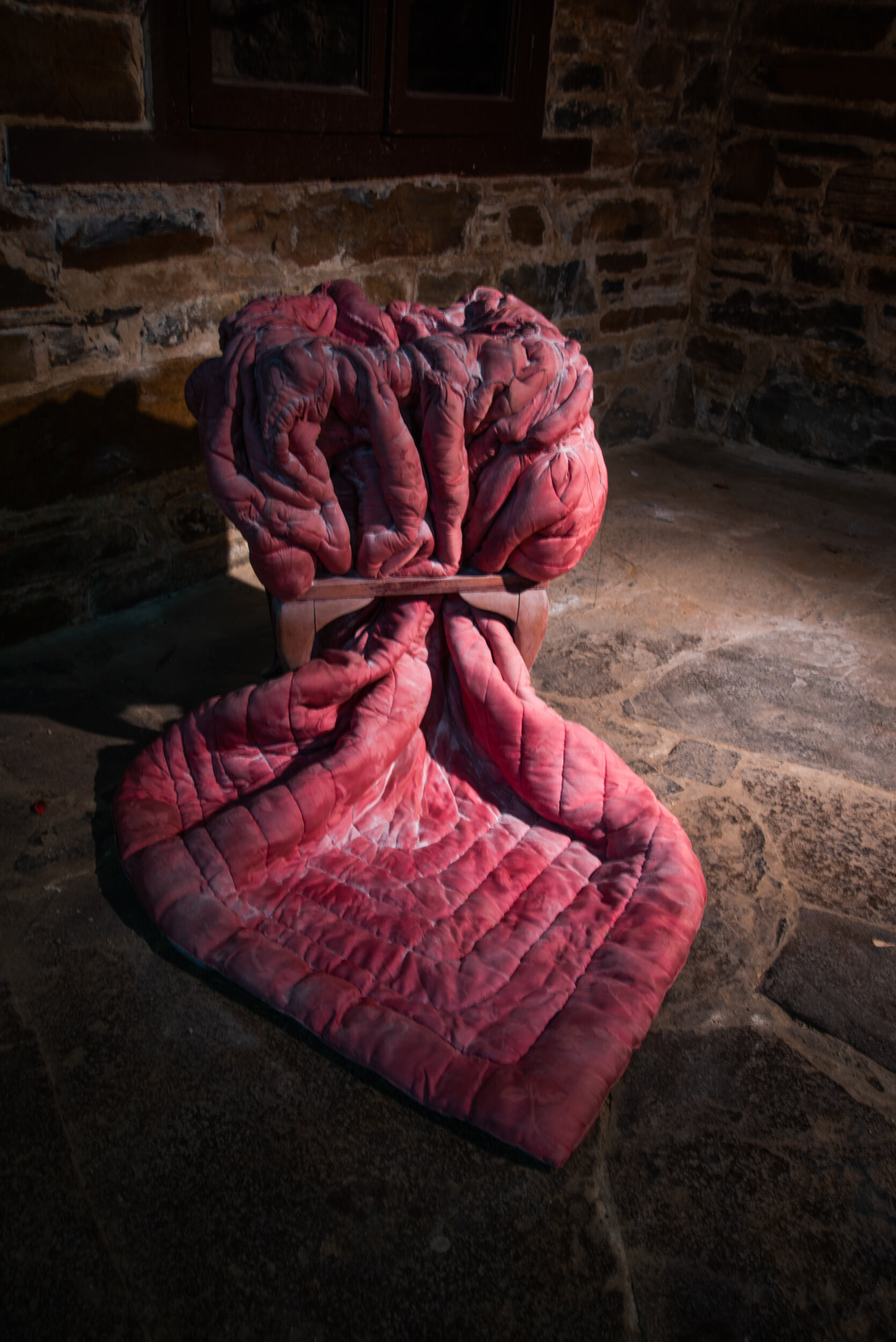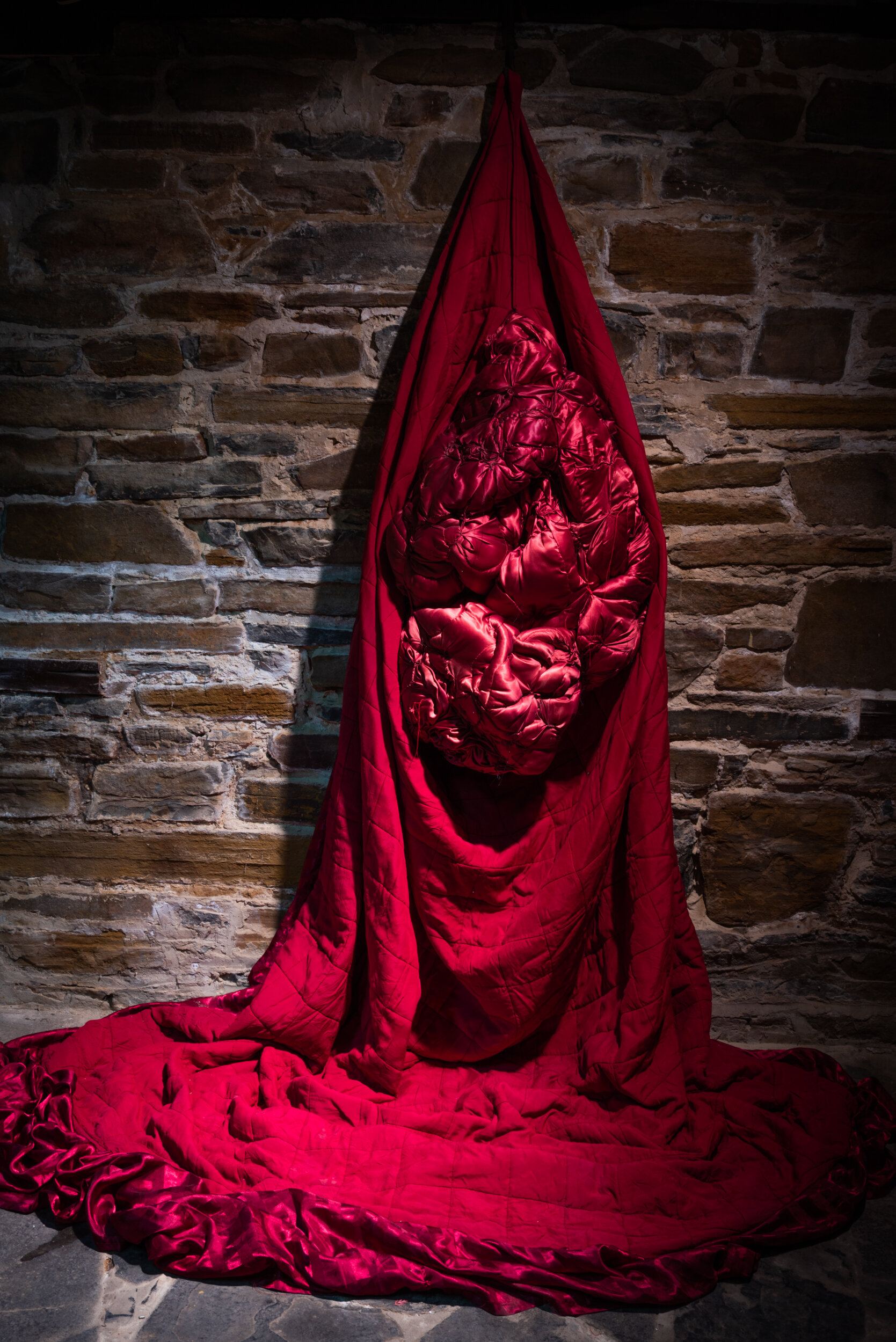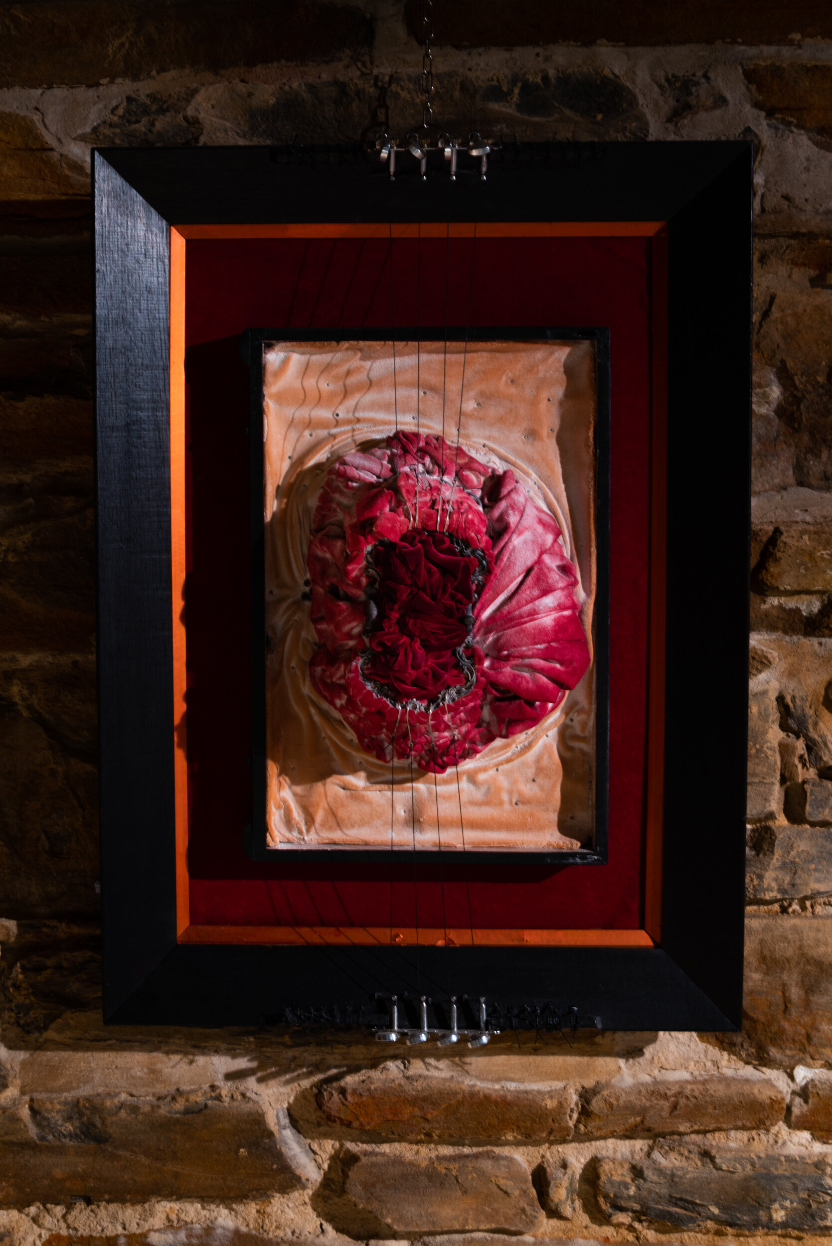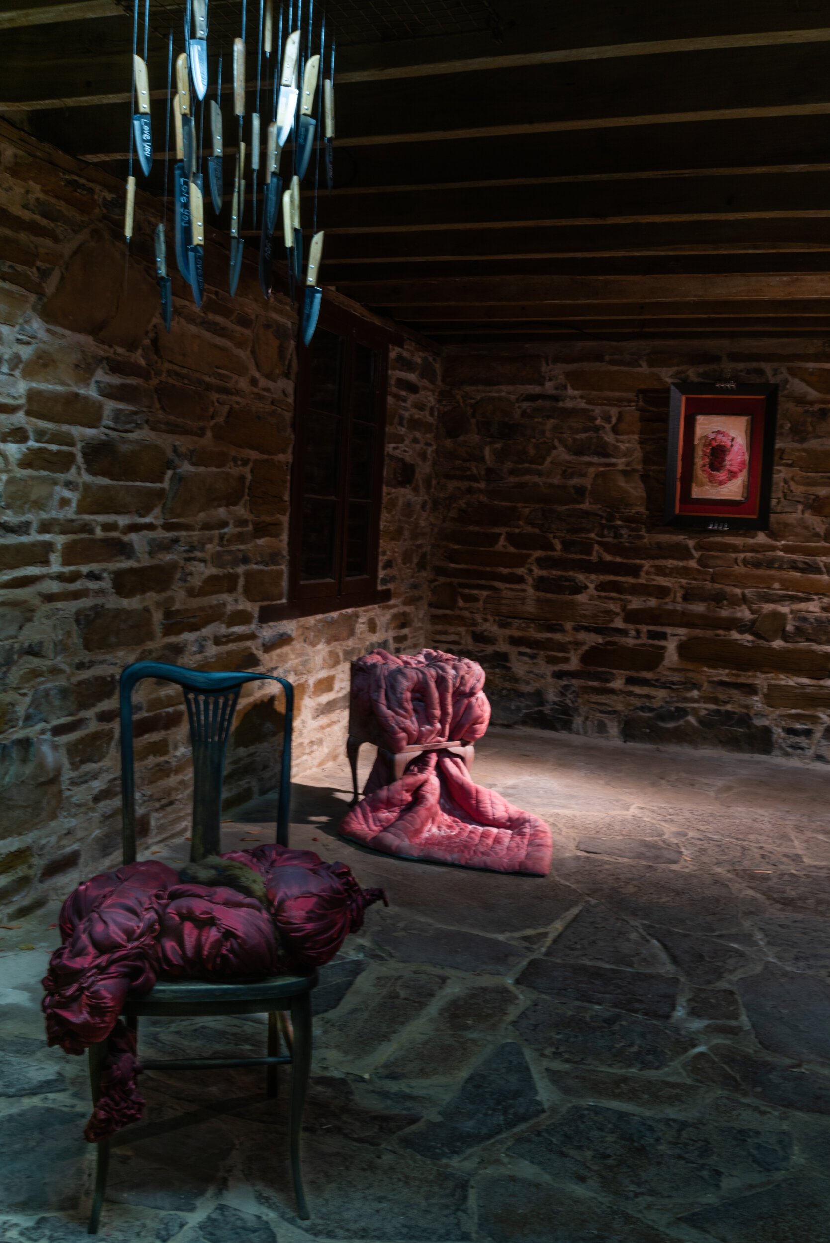 The exhibition continued downstairs in our cellar installation space where Ayman had two large works hanging from the rafters accompanied by a video film. Stones with the 99 names of God were placed within two of the recessed installation windows.