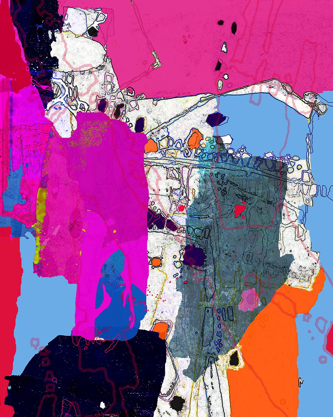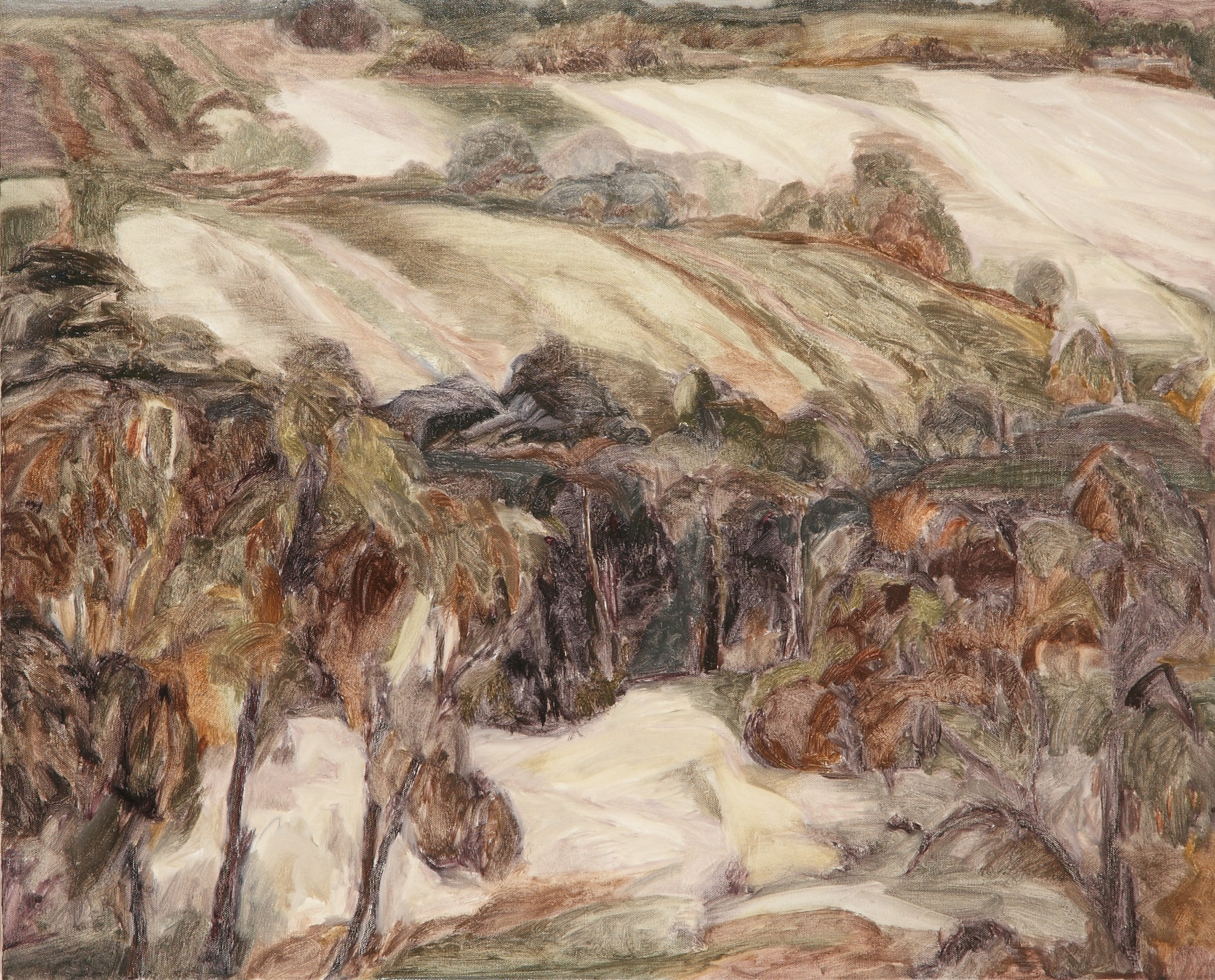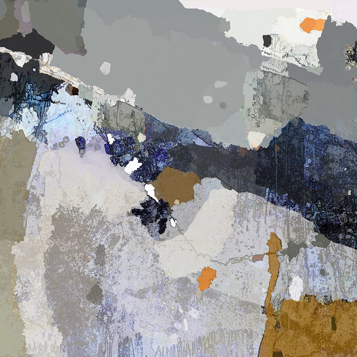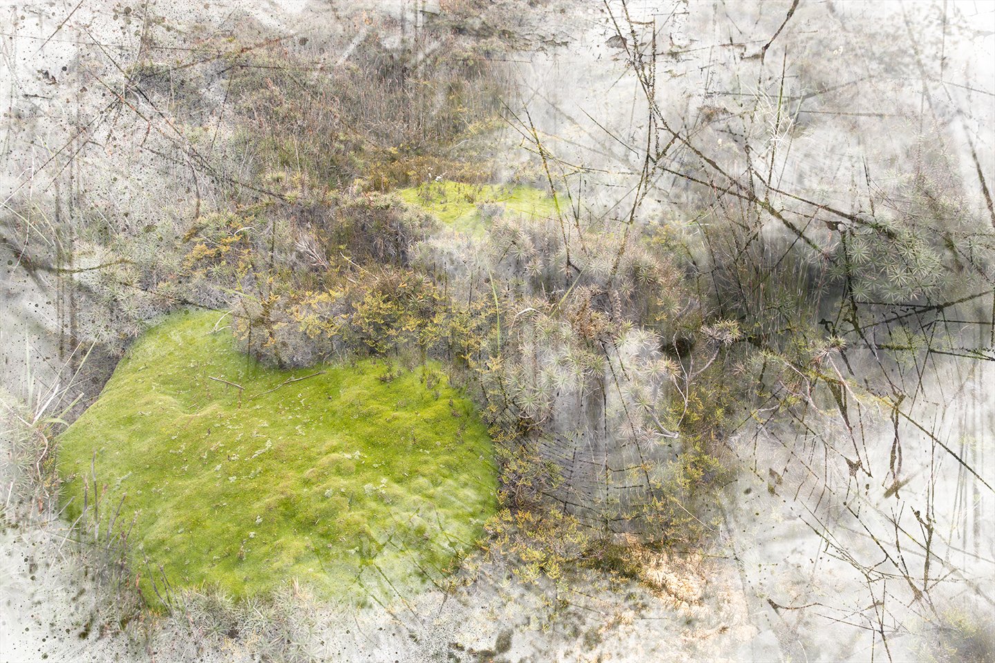 During a particularly grim winter in 2020 and 2021 when rain , cold and fog kept me inside for weeks on end I also resorted to creating new works on my computer .This process involves a lot of research and utilizing my vast archive of photographs , sketches and maps .I also scanned numerous photographs I had taken of natural surfaces such as lichen on rocks , patterns created by bark on tree trunks , veins in rock formations or clay pans . These were also incorporated into compositions with satellite and drone photographs. At that time of the year the region is dry and rich in softer tones such as yellow and brown.