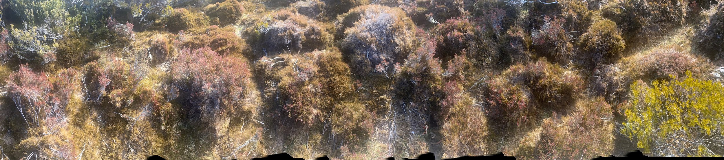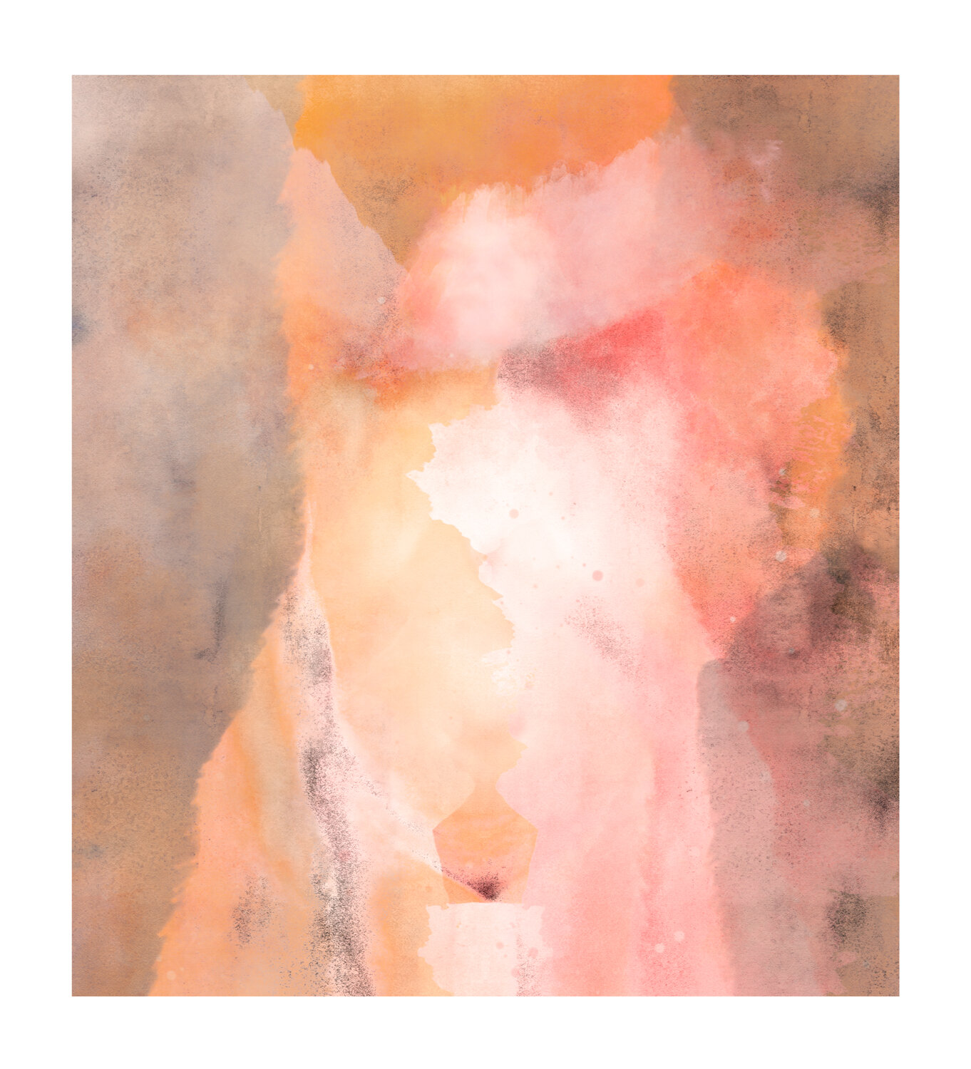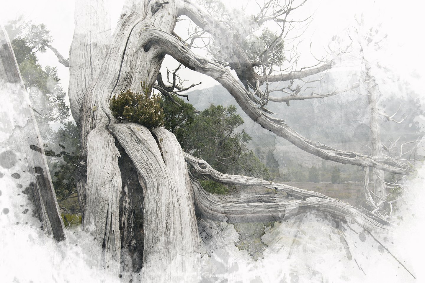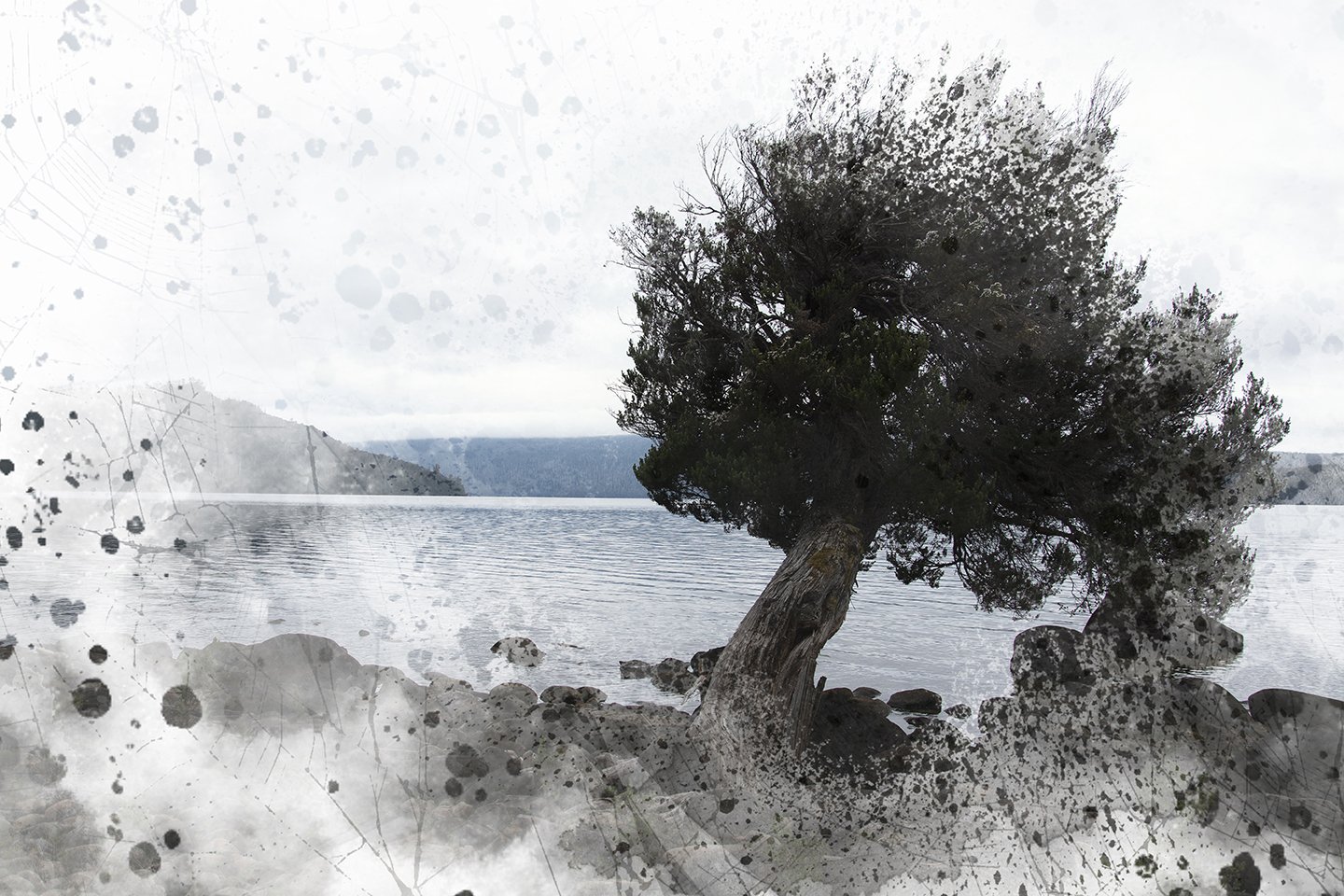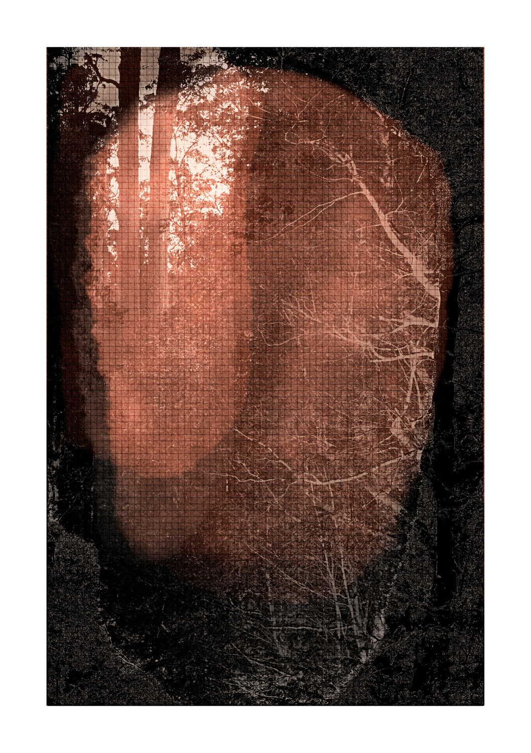 During a particularly grim winter in 2020 and 2021 when rain , cold and fog kept me inside for weeks on end I also resorted to creating new works on my computer .This process involves a lot of research and utilizing my vast archive of photographs , sketches and maps .I also scanned numerous photographs I had taken of natural surfaces such as lichen on rocks , patterns created by bark on tree trunks , veins in rock formations or clay pans . These were also incorporated into compositions with satellite and drone photographs. At that time of the year the region is dry and rich in softer tones such as yellow and brown.