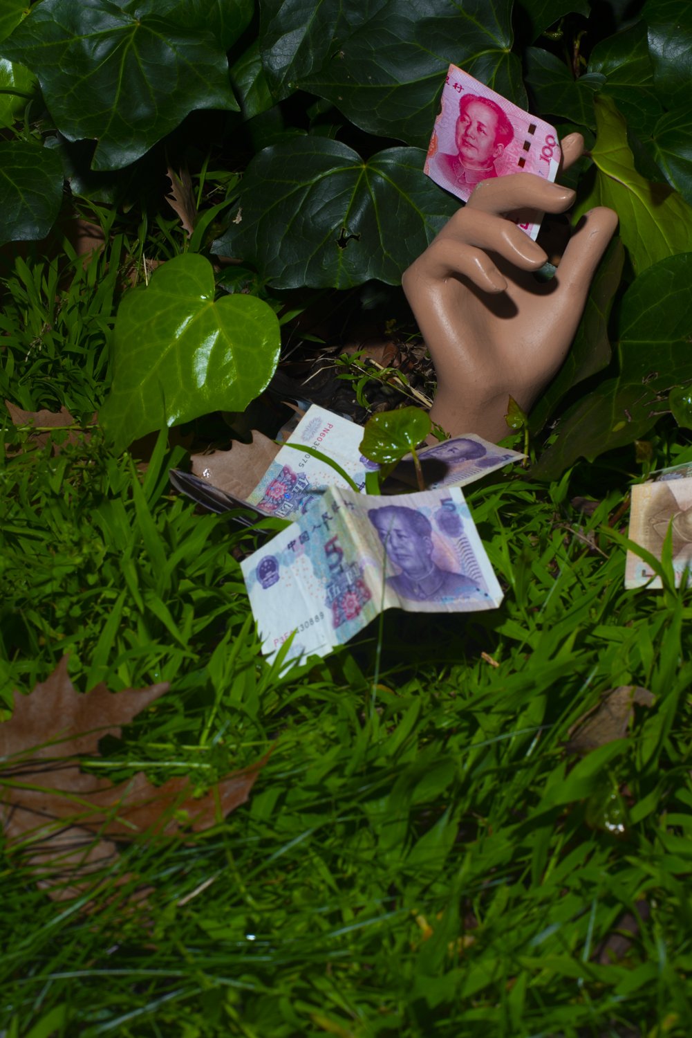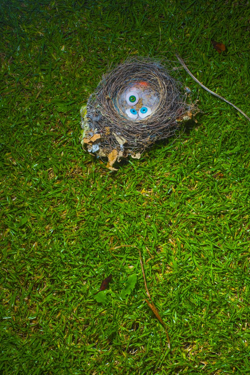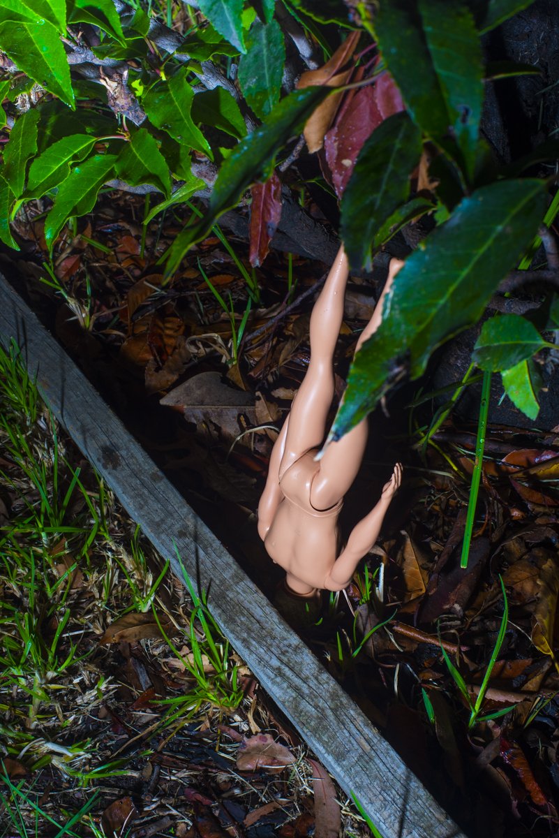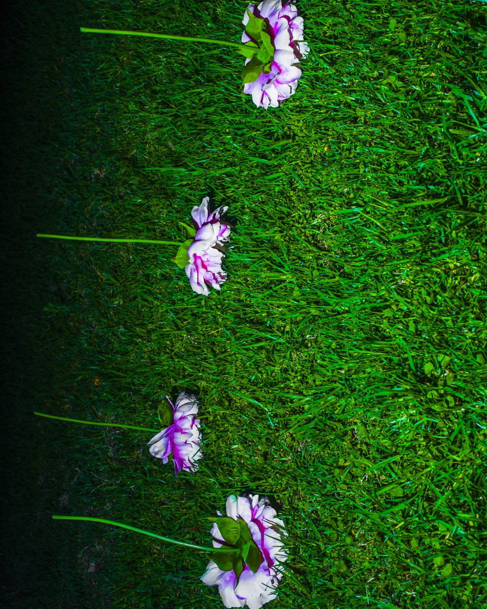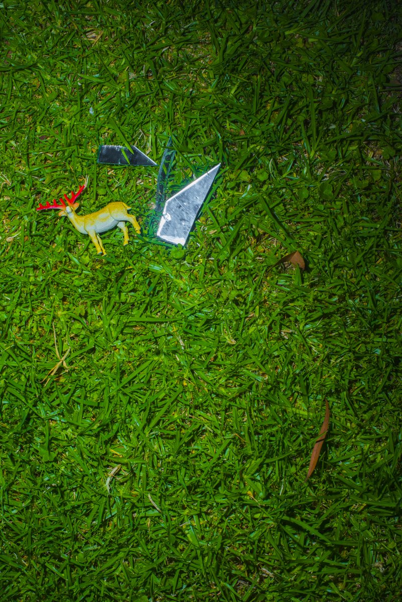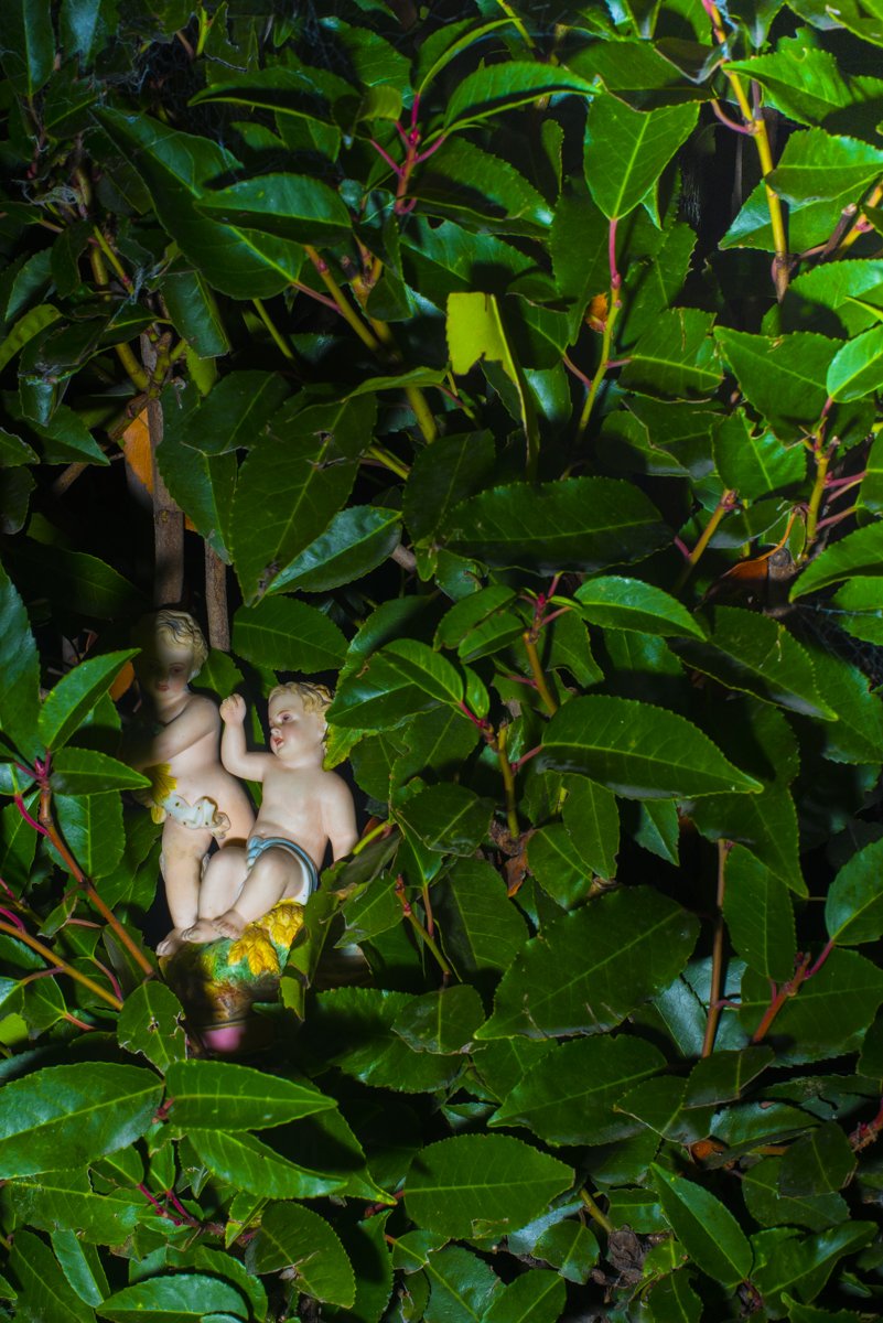 The environment was hedged partially giving it a feel of a maze of sorts with corners and edges around or behind which something might hide or surprise or wait. This heightened sense was always at night, so I decided to use flash at the same time each evening. The first images were grass and hedging as the shadows played along with the stark capture of the flash bringing greenness into high relief. I mapped out four square metres and only allowed myself to make pictures within this space.
