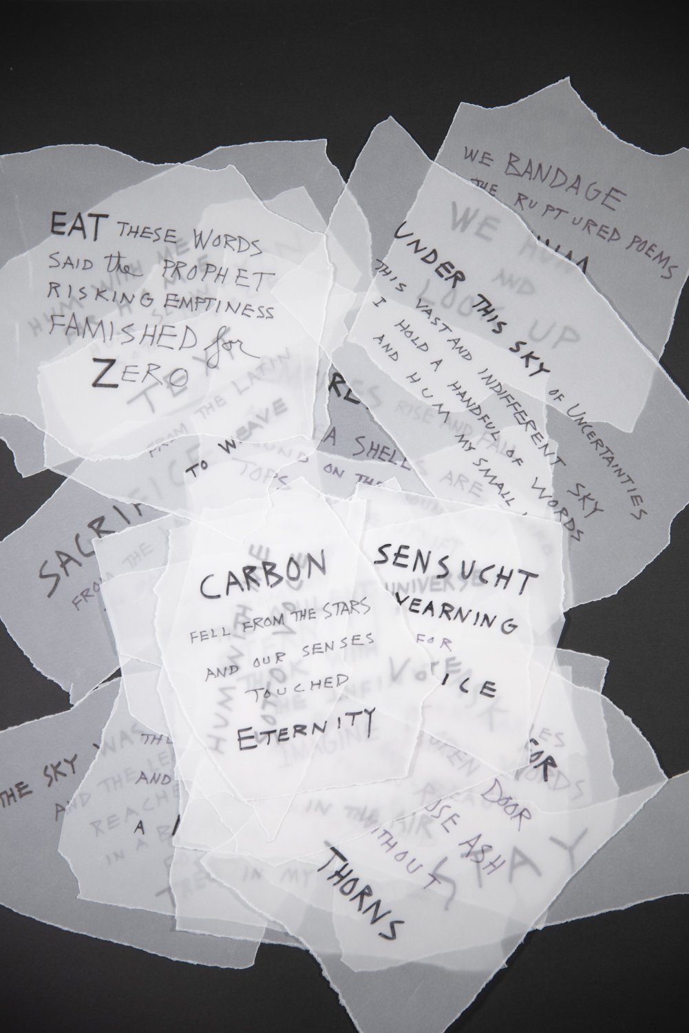 More and more, words are my paint and the structures I choose become my various compositions. In an atmosphere of global imbalance, violence and suffering, I need to pay attention to my time, to remember, to empathize and to make art that matters. And beauty may be a by-product and poems may rise up, in fragments. I call them bone-poems, essential and condensed.