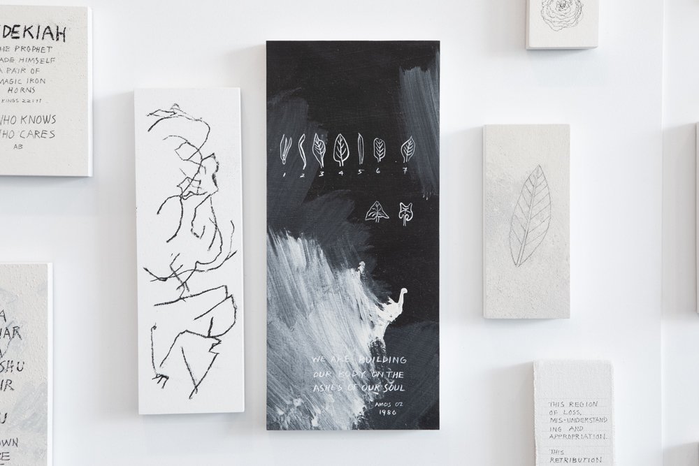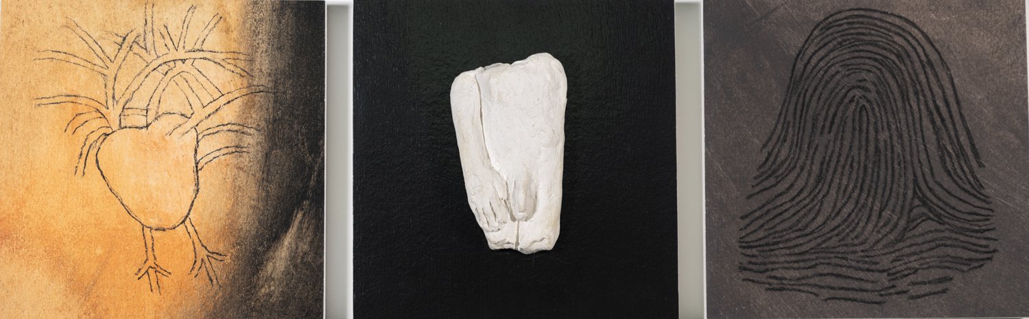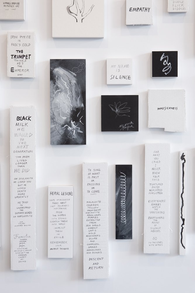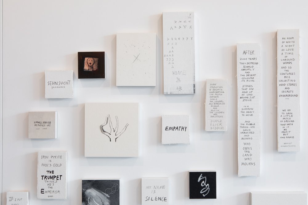 I use carbon, plaster, remnants and salt. I use grids, bell-jars, and rubber looping. I use blackboards, drawings, cloth and generic dolls covered in words. And I use granite from home, where there used to be gold, among those ancient rocks. But the core is always recognizably mine, because the need for meaning is always there, pushing, shoving and making unstoppable claims.