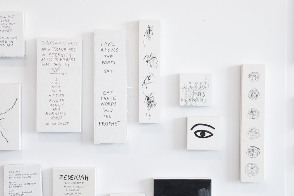 HENAYNI the title of my exhibition at EDGE galleries, is a transliteration of the Hebrew, meaning I am here (a witness). My work occupies both Gallery I and Gallery II down below, among the historic Ironmonger’s stone walls. Fragments of poems float on the walls upstairs. Portable Offerings, Shelters, Alphabets on fabric hangings, and a 5.4 metre long piece about bearing witness are also there. Downstairs are vitrines and their holdings, and small installations. There are silences in my work which will take time to absorb. I am collecting words against oblivion…..hunting and gathering the ruins and wonders of my time, looking for hope. I go like the poets, on my knees.