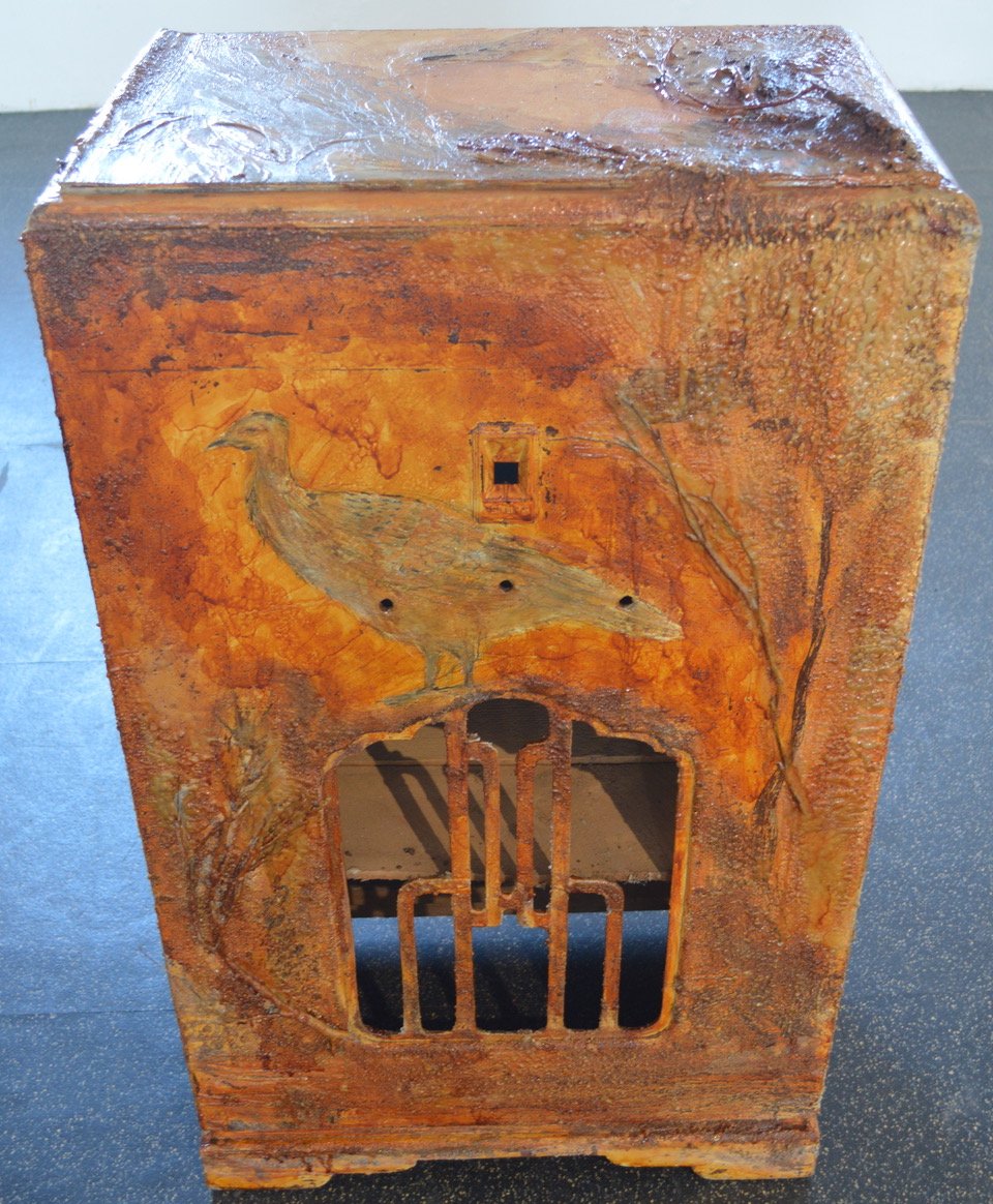 Orchestra of Extinction - A contemporary interpretation of a Cabinet of Curiosities that highlights extinction and the vulnerability of threatened species. Conceived in 2014 by Forest Keegel and Amanda King as a decade long project, in which they do annual residencies in threatened species habitat. Where they record sound and video to emanate from old radiogram cabinets that are encrusted with residues of habitat, such as varnish made from plant saps and local beeswax. Each of these cabinets become an archive for a particular species forming a record of what King and Keegel have learnt about them through research, time walking and recording in their habitat and speaking with scientists and local experts. They never imagined koala would be added to the list or that the perils and threats to the biosphere would become so severe so rapidly. This showing of work in development at Edge Galleries is and the first time the ensemble of cabinets has been exhibited.